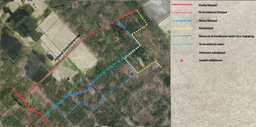Het oorspronkelijke begrazingsgebied bij de Zevenhuizerweg wordt iets verkleind. De toren komt aan de rand van dit gebied. Ook passen we wandel- en fietspaden aan, zodat de uitkijktoren goed toegankelijk wordt: