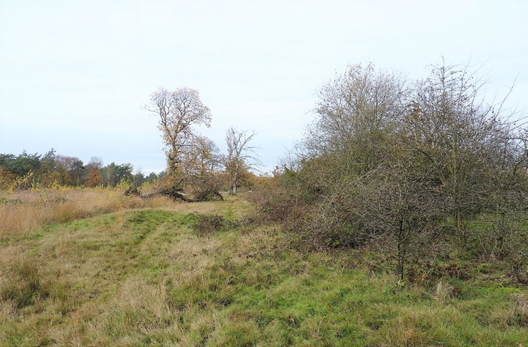 Dit is 2017. Het Engels raaigras verdwijnt langzaam om plaats te maken voor wel 30 soorten kruiden en grassen. Het streepje grond is een wissel voor de dieren. Geen pad voor mensen! Rechts ervan staat een meidoorn. Je kunt goed zien dat hij boven de vraatgrens uitloopt. Braam groeit er overheen. Over een paar jaar is het zó dichtgegroeid dat je je hand er niet meer in kunt steken. Een mooie plek voor de grauwe klauwier, die zit hier goed beschut.